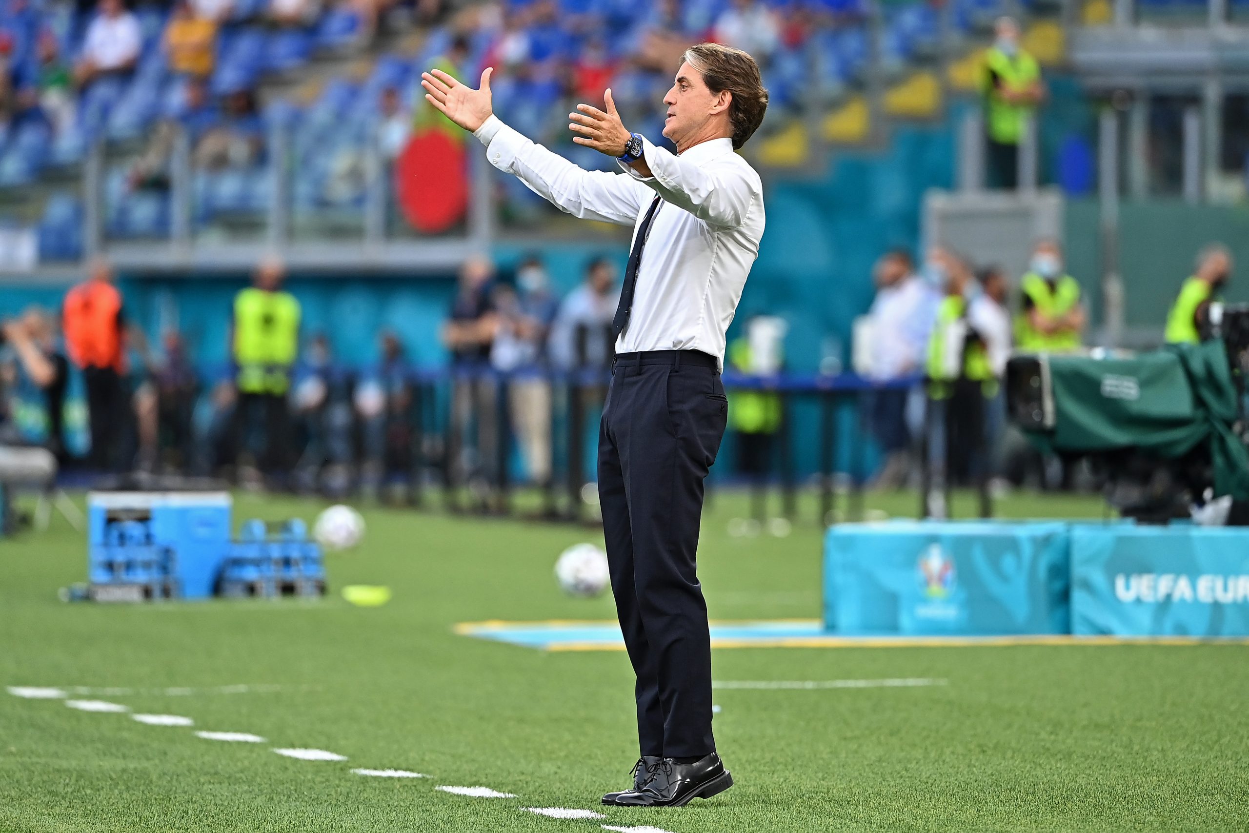 ROME, ITALY - JUNE 20: Roberto Mancini, Head Coach of Italy reacts during the UEFA Euro 2020 Championship Group A match between Italy and Wales at Olimpico Stadium on June 20, 2021 in Rome, Italy. (Photo by Andreas Solaro - Pool/Getty Images)