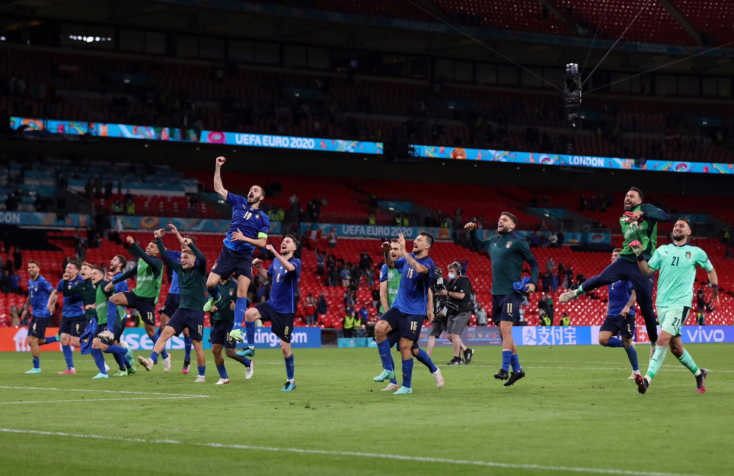 LONDON, ENGLAND - JUNE 26: Leonardo Bonucci of Italy and teammates celebrate after victory in the UEFA Euro 2020 Championship Round of 16 match between Italy and Austria at Wembley Stadium at Wembley Stadium on June 26, 2021 in London, England. (Photo by Carl Recine - Pool/Getty Images)