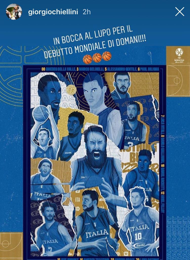 A dare la carica ai nostri ragazzi è stato il difensore e capitano della Juve, Giorgio Chiellini che, ha postato una storia sul suo account Instagram, la quale ritrae tutta la squadra della nazionale italiana di basket, con annessa citazione: “In bocca al lupo per il debutto Mondiale di domani”.