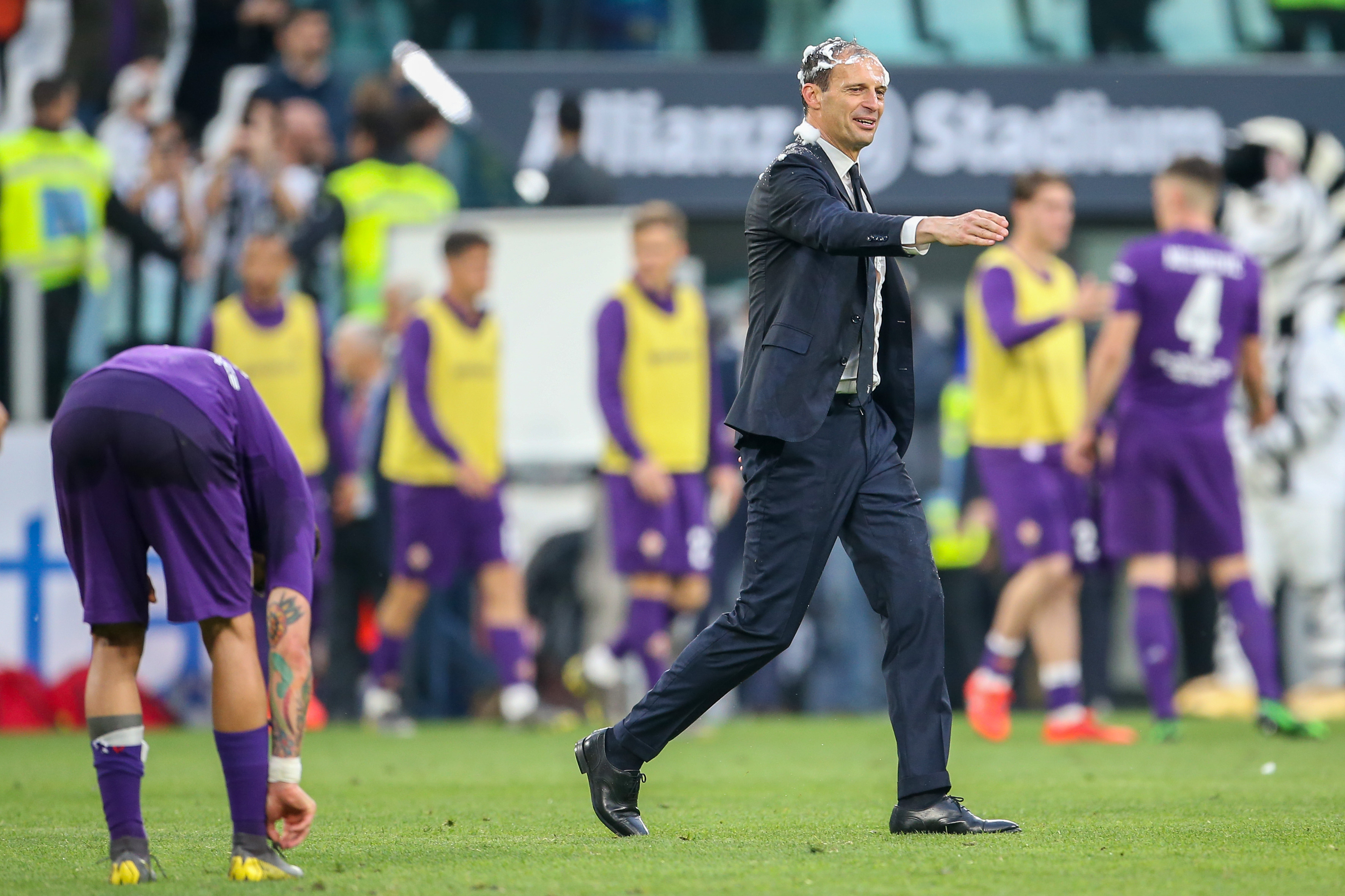 TURIN, ITALY - APRIL 20: Coach Massimiliano Allegri of Juventus celebrates after winning the italian league at the end of the Serie A match between Juventus and ACF Fiorentina on April 20, 2019 in Turin, Italy. (Photo by Giampiero Sposito/Getty Images)