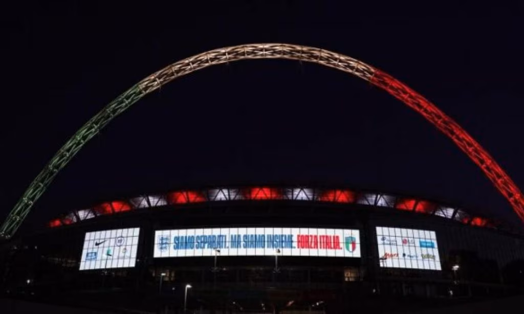 L’ultima di queste in favore del Bel Paese è quella che arriva dall’Inghilterra, più precisamente da Londra, Wembley Stadium: nella serata in cui si sarebbe dovuta disputare l’amichevole tra Inghilterra e Italia, lo stadio di Wembley si è colorato di verde bianco e rosso, dedicando un messaggio all’Italia: “Siamo separati ma siamo insieme. Forza Italia”
