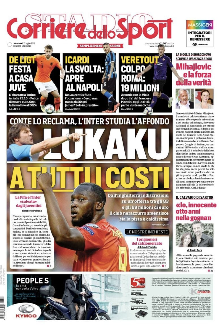 TORINO – Di seguito vi proponiamo l’apertura del quotidiano nazionale Corriere dello Sport di oggi, 17/07/2019 , disponibile in tutte le edicole. In apertura la questione che riguarda il mercato ed in particolare quello dell’Inter, con Marotta che insiste per Lukaku. In alto il colpo Roma da 19 milioni per Veretout e l’affare Icardi-Napoli.