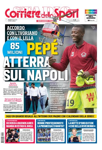 TORINO – Di seguito vi proponiamo l’apertura del quotidiano nazionale Corriere dello Sport di oggi, 26/07/2019, disponibile in tutte le edicole. In apertura la questione che riguardal’accordo che il Napoli di ADL avrebbe raggiungo con Pepé: 85 milioni da pagare al Lille per accaparrarselo e ora può scattare il domino di mercato.