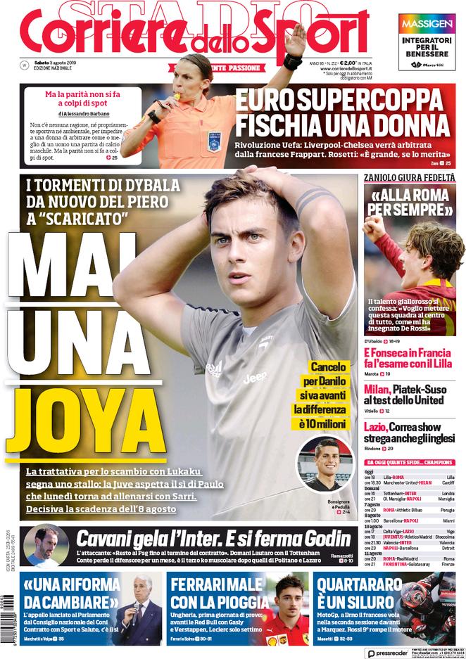 TORINO – Di seguito vi proponiamo l’apertura del quotidiano nazionale Corriere dello Sport di oggi, 03/08/2019, disponibile in tutte le edicole. In apertura la questione che riguarda Dybala e il possibile addio: “Mai un Joja, i tormenti di Paulo”, titola il quotidiano. In alto la finale di SuperCoppa affidata ad un arbitro donna.