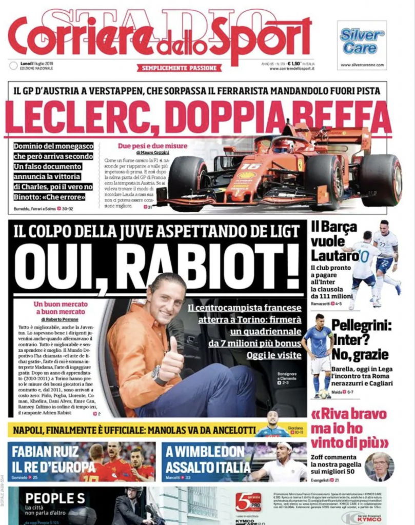 TORINO – Di seguito vi proponiamo l’apertura del quotidiano nazionale Corriere dello Sport di oggi, 04/06/2019, disponibile in tutte le edicole. Il centrocampista francese atterra a Torino. Firmerà un quadriennale da 7 milioni più bonus. Oggi le visite. L’Inter a destra: il Barca vuole Lautaro. Il club, pronto a pagare all’Inter la clausola da 111 milioni. Pellegrini, Inter? No grazie.