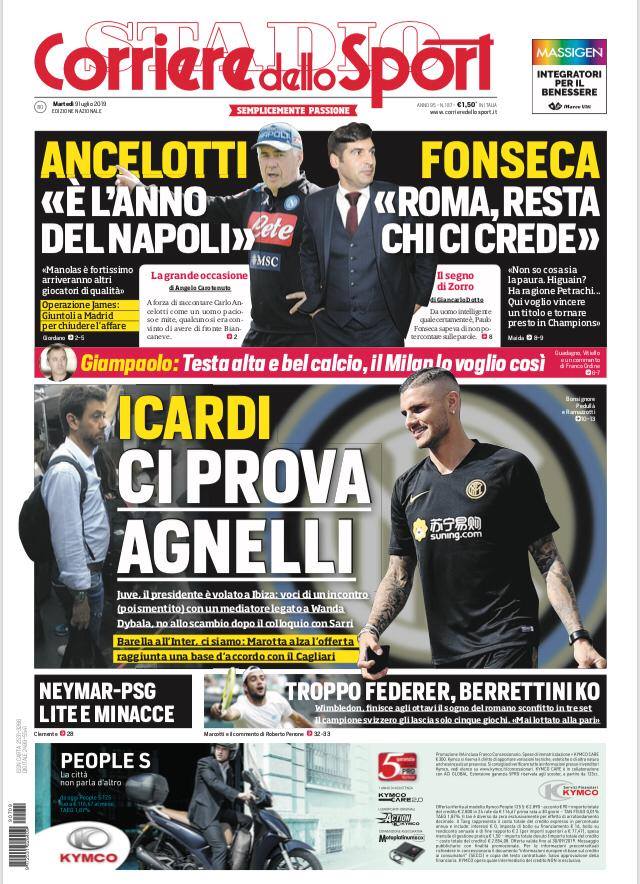 TORINO – Di seguito vi proponiamo l’apertura del quotidiano nazionale Corriere dello Sport di oggi, 09/07/2019, disponibile in tutte le edicole. In apertura la questione che riguarda Icardi e il suo futuro che a detta dell’AD Marotta, è sempre più lontano dall’Inter. In alto la questione Roma con Ancelotti che grida all'”anno del Napoli”.