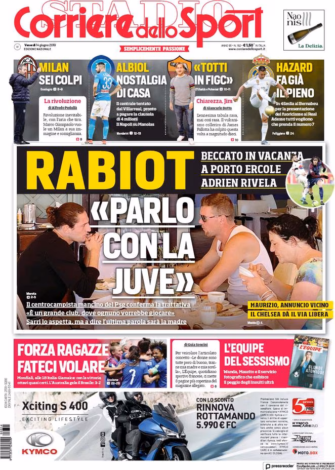 TORINO – Di seguito vi proponiamo l’apertura del quotidiano nazionale Corriere dello Sport di oggi, 14/06/2019, disponibile in tutte le edicole. In apertura la questione che riguarda Adrien Rabiot e il suo possibile approdo alla Juventus. “Parlo con la Juve”, ha detto il francese beccato in vacanza a Porto Ercole.