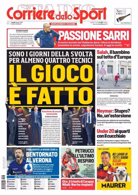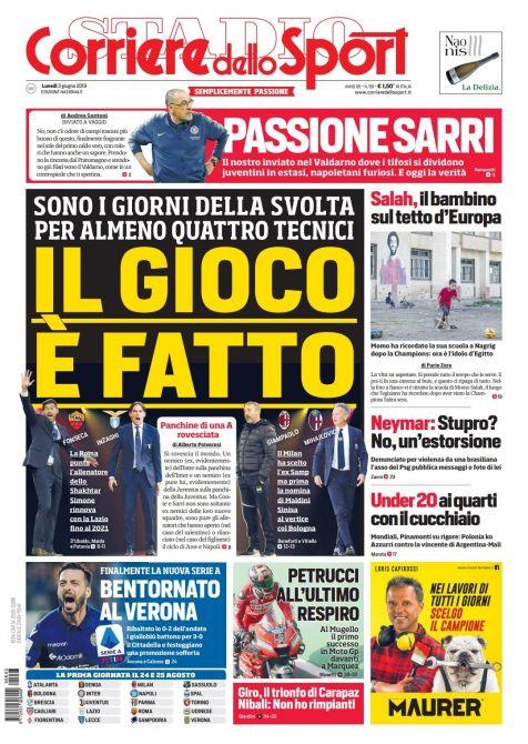 TORINO – Di seguito l’apertura del quotidiano nazionale Corriere dello Sport di oggi, 03/06/2019. In apertura la questione che riguarda il valzer di allenatori sulla panchina di Milan, Roma, Bologna e Lazio: tutti o quasi che si incrociano con la scelta del tecnico della Juventus per la prossima stagione 2019/2020.