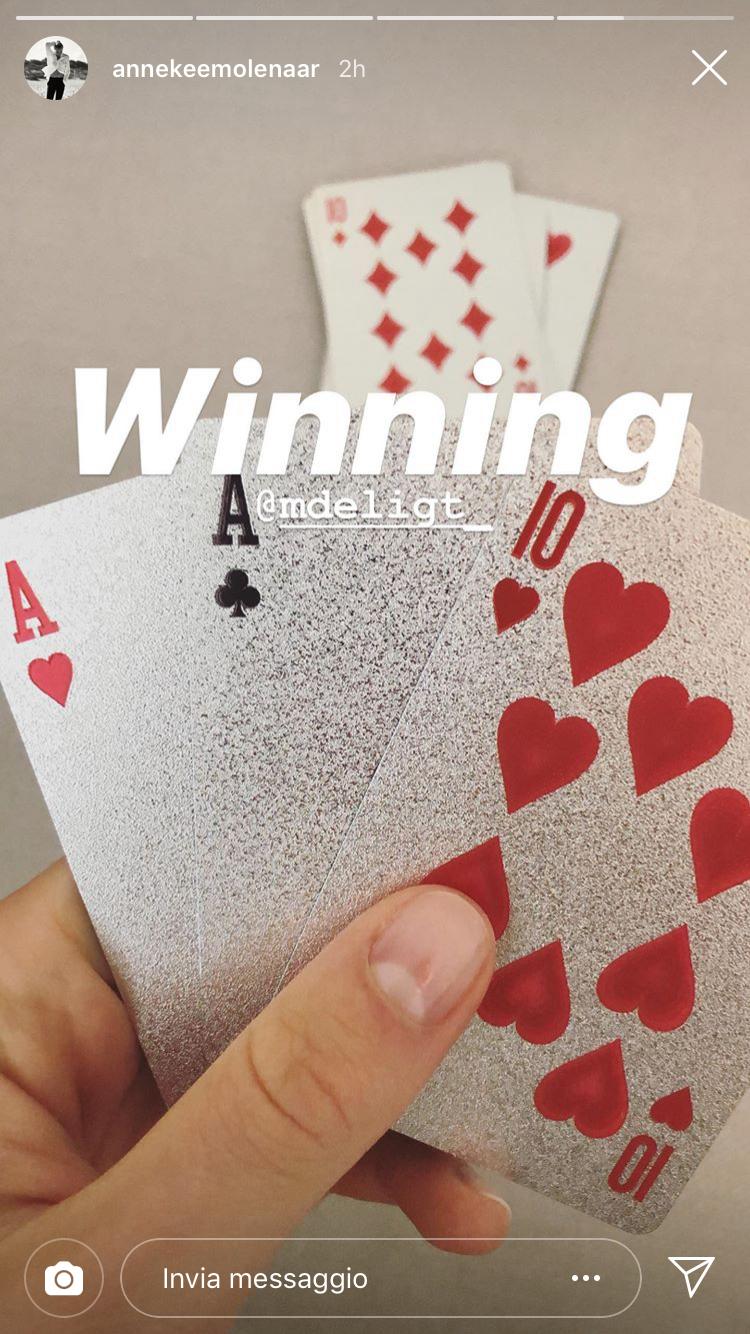 Ecco la Instagram Story pubblicista dalla sua compagna, che dichiara di star battendo lo stesso De Ligt a carte. I tifosi sperano che la cosa non si ripeta a Torino, magari su un campo di calcio…