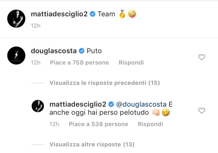 TORINO – Clima disteso in casa bianconera, fin troppo forse a pochi giorni dall’inizio della nuova stagione. Questa volta le attenzioni le hanno attirate Mattia De Sciglio e Douglas Costa che si sono scambiati qualche parole su Instagram. “Che squadra”, scrive l’italiano. “C***””, gli risponde il brasiliano, ed ecco come è andata poi a finire: