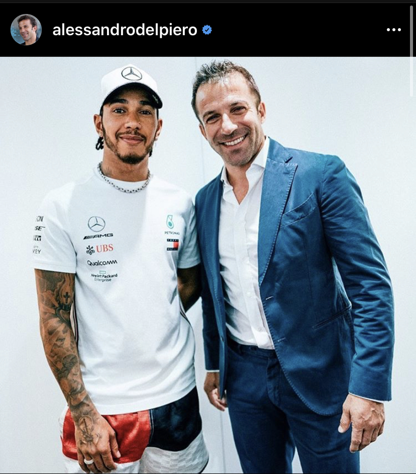 TORINO – L’ex capitano della Juventus Alessandro Del Piero, ha voluto omaggiare un’ altra grande stella del mondo dello sport attraverso il suo account Instagram. Nella notte infatti Pinturicchio, ha postato una foto insieme al pilota della F1 Lewis Hamilton, celebrandolo poi con il seguente messaggio sotto all’immagine: “Il cuore è rosso Ferrari, ma di fronte a fenomeni del genere ( e ai suoi record) ci sono solo applausi. Complimenti Lewis, immenso campione”. Chissà come reagirà il pluricampione statunitense di fronte alle lusinghe di uno dei più grandi numeri 10 di sempre della storia del calcio.