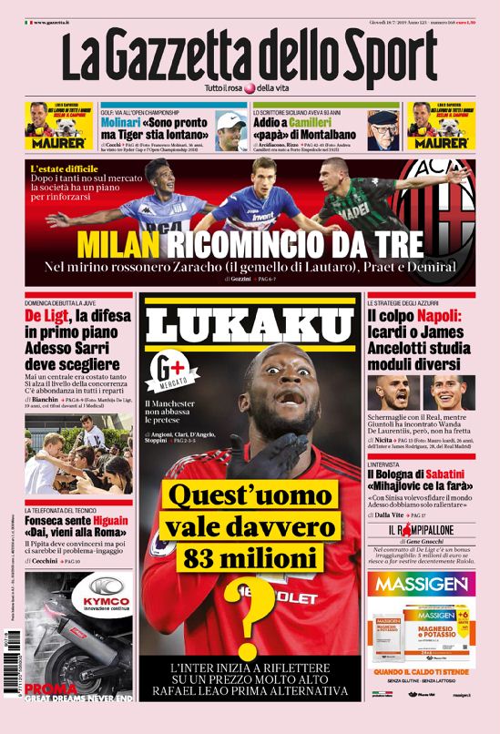 TORINO – Di seguito vi proponiamo l’apertura del quotidiano nazionale La Gazzetta dello Sport di oggi, 18/07/2019 disponibile in tutte le edicole. In apertura la questione relativa a Lukaku e la Gazzetta di pone una domanda: vale davvero 83 milioni? In alto il Milan con 3 nuovi obiettivi: Zaracho, Praet e Demiral.