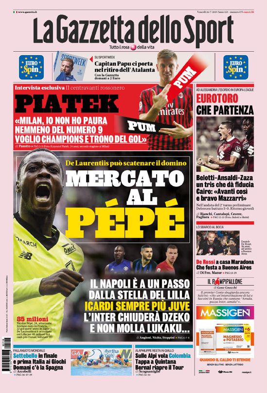 TORINO – Di seguito vi proponiamo l’apertura del quotidiano nazionale La Gazzetta dello Sport di oggi, 26/07/2019 disponibile in tutte le edicole. In apertura la questione relativa all’assalto che il Napoli sta portando per l’attaccante del Lille, Pepé. In alto un’intervista a Piatek, che parte scatenato in vista della nuova stagione.