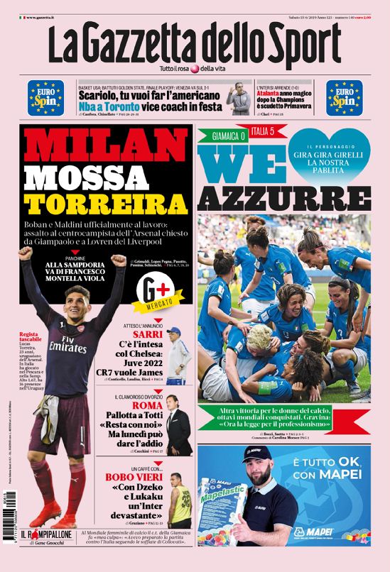 TORINO – Di seguito vi proponiamo l’apertura del quotidiano nazionale La Gazzetta dello Sport di oggi, 04/06/2019 disponibile in tutte le edicole. In apertura la questione relativa al mercato del Milan con l’obiettivo Torreira in prima linea. Confermato il duo dirigenziale Boban Maldini. A destra capitolo mondiale femminile con il trionfo delle azzurre.