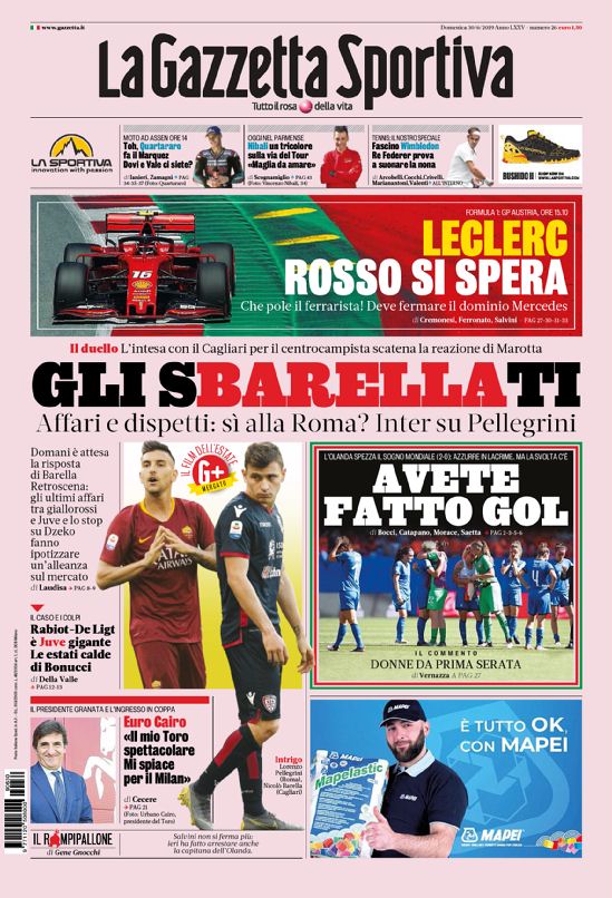 TORINO – Di seguito vi proponiamo l’apertura del quotidiano nazionale La Gazzetta dello Sport di oggi, 30/06/2019 disponibile in tutte le edicole. In apertura la questione relativa a Barella e alla lotta per accaparrarselo da parte di Inter e Roma. In alto panoramica sulla F1 con la strepitosa pole di Charles Leclerc nel GP d’Austria che scatta nel pomeriggio.