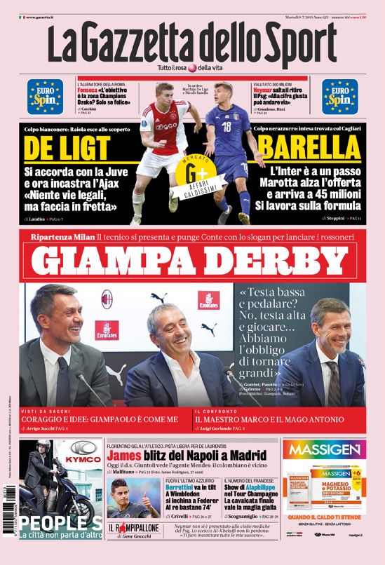 TORINO – Di seguito vi proponiamo l’apertura del quotidiano nazionale La Gazzetta dello Sport di oggi, 09/07/2019 disponibile in tutte le edicole. In apertura la questione relativa al nuovo Milan di Giampaolo che sfida Conte che dice: “Testa bassa e pedalare” e il nuovo tecnico rossonero: “Testa alta e giocare”.