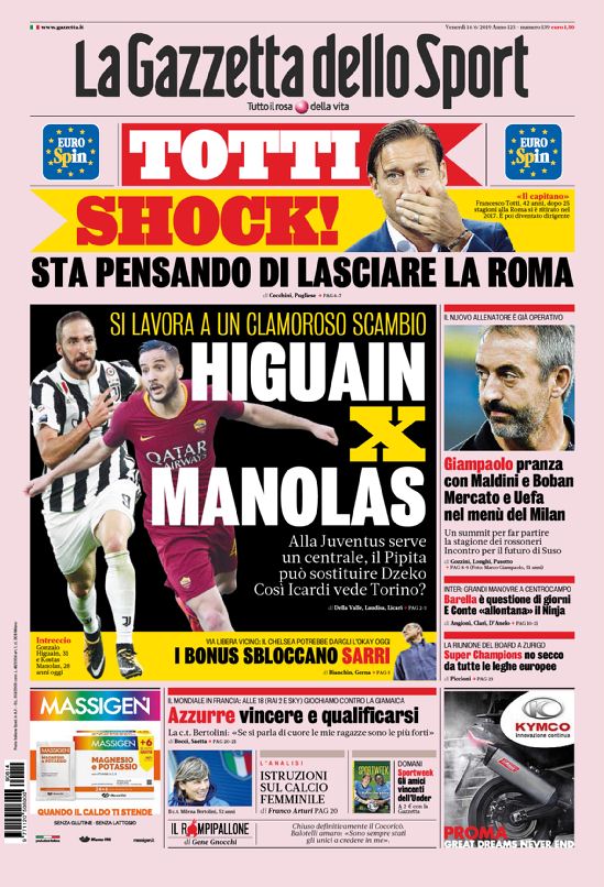 TORINO – Di seguito vi proponiamo l’apertura del quotidiano nazionale La Gazzetta dello Sport di oggi, 14/06/2019 disponibile in tutte le edicole. In apertura la questione relativa all’ipotesi di scambio fra Juventus e Roma per Higuain e Manolas. In taglio alto si parla di Totti e del suo possibile addio alla Roma.