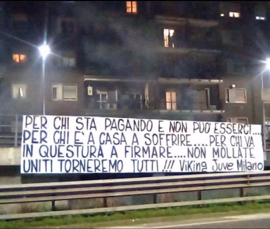 TORINO – Questa sera la Juventus sarà impegnata nella delicata e importantissima trasferta di Lione, in quella che sarà la gara di andata degli ottavi di Champions e di conseguenza, è inutile negare che tutte le attenzioni dei sostenitori della Vecchia Signora, sono rivolte a quello che accadrà allo stadio Louis II. Nella notte però, i maggiori esponenti della curva bianconera hanno voluto dedicare il loro supporto, a tutti i tifosi juventini che, per qualche motivo non riescono a sostenere la loro squadra del cuore da vicino. E’ apparso nella città di Milano infatti, uno striscione del gruppo Viking Juve Milano che, recita così: “Per chi sta pagando e non può esserci… Per chi è a casa a soffrire…Per chi va in questura a firmare…Non mollate, uniti torneremo tutti!!!”, ricondivisa poi dai Drughi sulla loro pagina social di Instagram. Questo mostra fortemente, quanto il tifo bianconero, in questo momento, sia unito piu che mai per un obiettivo comune.