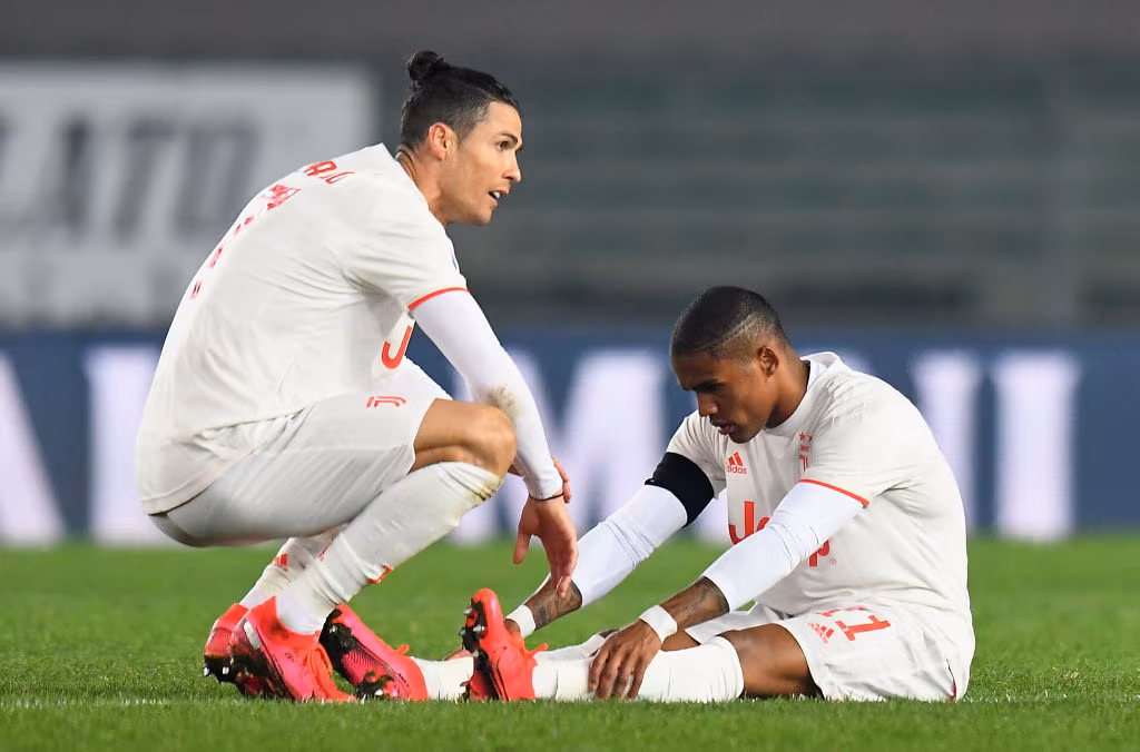 VERONA, ITALY - FEBRUARY 08: Cristiano Ronaldo of Juventus and Douglas Costa of Juventus during the Serie A match between Hellas Verona and Juventus at Stadio Marcantonio Bentegodi on February 8, 2020 in Verona, Italy. (Photo by Alessandro Sabattini/Getty Images)
