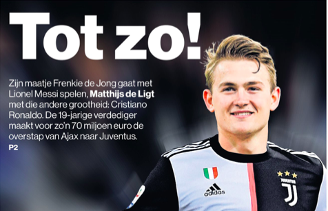 TORINO – Il difensore dell’Ajax Matthijs de Ligt sembra essere sempre più vicino alla Juventus, con l’affare che sembra essere in dirittura d’arrivo. La chiusura dovrebbe arrivare entro il week end o al massimo all’inizio della prossima settimana: il giocatore non è partito con i compagni per l’Austria e rimarrà ad Amsterdam ad allenarsi mentre aspetta la Juventus. In Olanda intanto l’affare è già dato per concluso, tanto che il popolare quotidiano sportivo Sportwereld apre con la foto del difensore olandese in maglia bianconera e la scritta “A presto!”, con il giornale che continua: “Il suo amico Frenkie de Jong va da Lionel Messi, Matthijs de Ligt va con l’altro gigante: Cristiano Ronaldo. Il difensore 19enne si trasferisce per 70 milioni di euro dall’Ajax alla Juventus”. Ma attenzione perché la vera bomba di giornata è un’altra ed è arrivata poco fa. Altri botti in arrivo, annuncio clamoroso: “Colpo da almeno 80 milioni, Sarri lo vuole a tutti i costi!” >>>VAI ALLA NOTIZIA