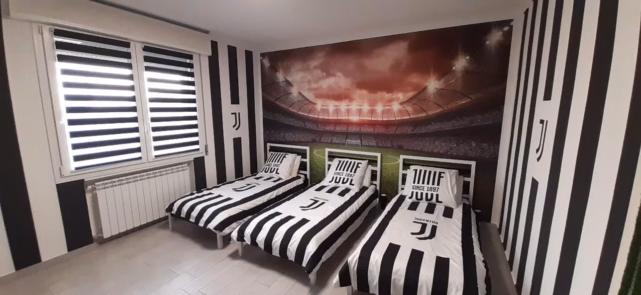 Bernardo Pasquale, residente a Roverchiara in Veneto e grande tifoso della Juventus, ha voluto premiare la fede bianconera dei figli con un regalo davvero originale: dalle pareti a strisce bianconere alle lenzuola del letto e dei cuscini con il logo della Vecchia Signora, dalla parete con una grande immagine dell’Allianz Stadium alla porta, dietro la quale è riprodotto un campo da calcio, il genitore ha trasformato la camera in un vero e proprio stadio, per la felicità dei suoi piccoli bianconeri.