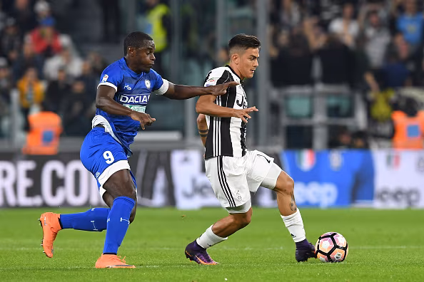 TURIN, ITALY - OCTOBER 15: Paulo Dybala (R) of Juventus FC is challenged by Duvan Zapata of Udinese Calcio during the Serie A match between Juventus FC and Udinese Calcio at Juventus Stadium on October 15, 2016 in Turin, Italy. (Photo by Valerio Pennicino/Getty Images)