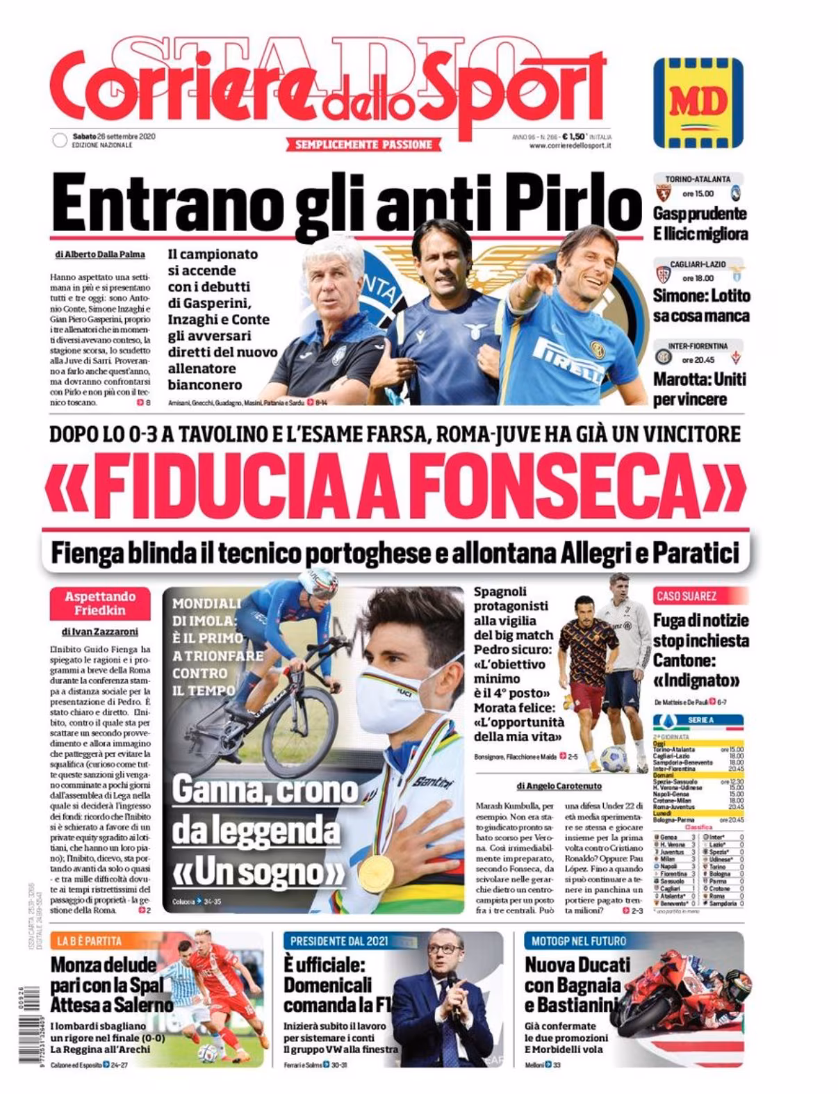 “Entrano gli anti Pirlo” titola il giornale, con Lazio, Atalanta e Inter che faranno oggi il loro debutto in campionato. In basso le parole di Fienga sull’allenatore della Roma Fonseca, sul quale ha fugato i dubbi nella conferenza stampa di ieri: “Fiducia a Fonseca”