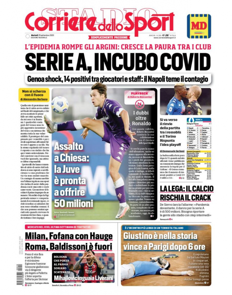 TORINO – La prima pagina de Il Corriere dello Sport in edicola oggi dedica il suo taglio alto all'”Incubo COVID” che ha colpito la Serie A dopo i 14 risultati positivi ai tamponi nel Genoa.
