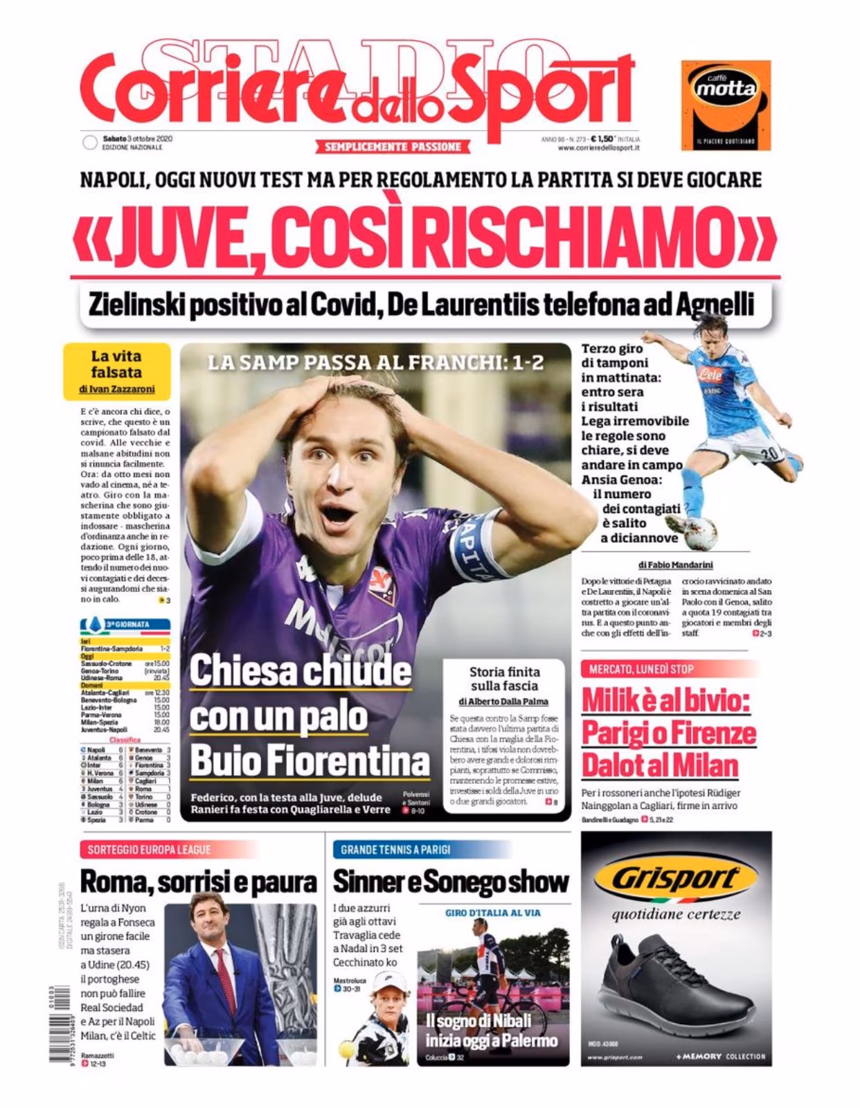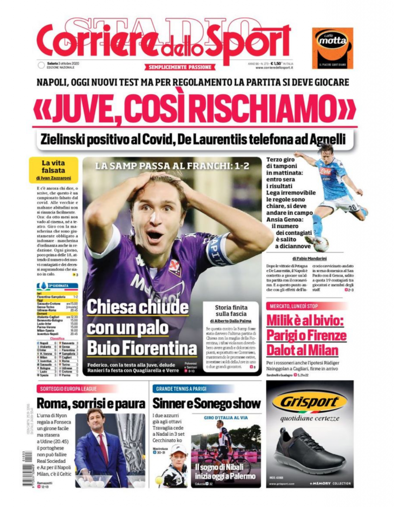 “Juve così rischiamo” il titolo che campeggia in alto “Zielinski positivo al COVID, de Laurentiis telefona ad Agnelli. Oggi nuovi test ma per regolamento la partita si deve giocare.”