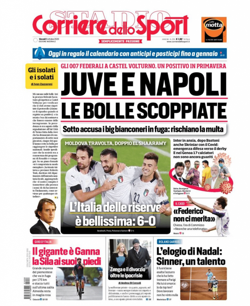 TORINO – La prima pagina de Il Corriere dello Sport in edicola oggi è dedicata ancora una volta alle questioni legate a Juventus-Napoli: “Juve e Napoli le bolle scoppiate” titola il giornale che prosegue “Gli 007 federali a Castel Volturno. Un positivo in primavera. Sotto accusa i big bianconeri in fuga: rischiano la multa.”