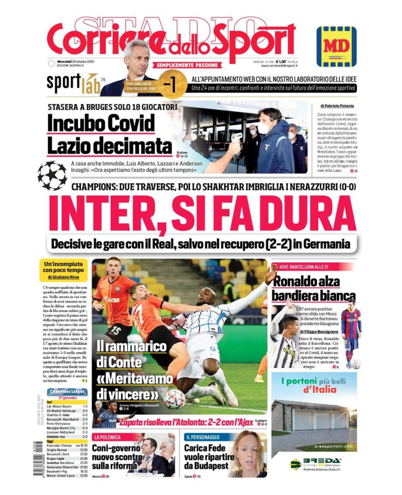 Al centro l’Inter, per cui dopo il pareggio di ieri “Si fa dura”. Di spalla la Juventus, avversaria del Barcellona questa sera senza Cristiano Ronaldo.