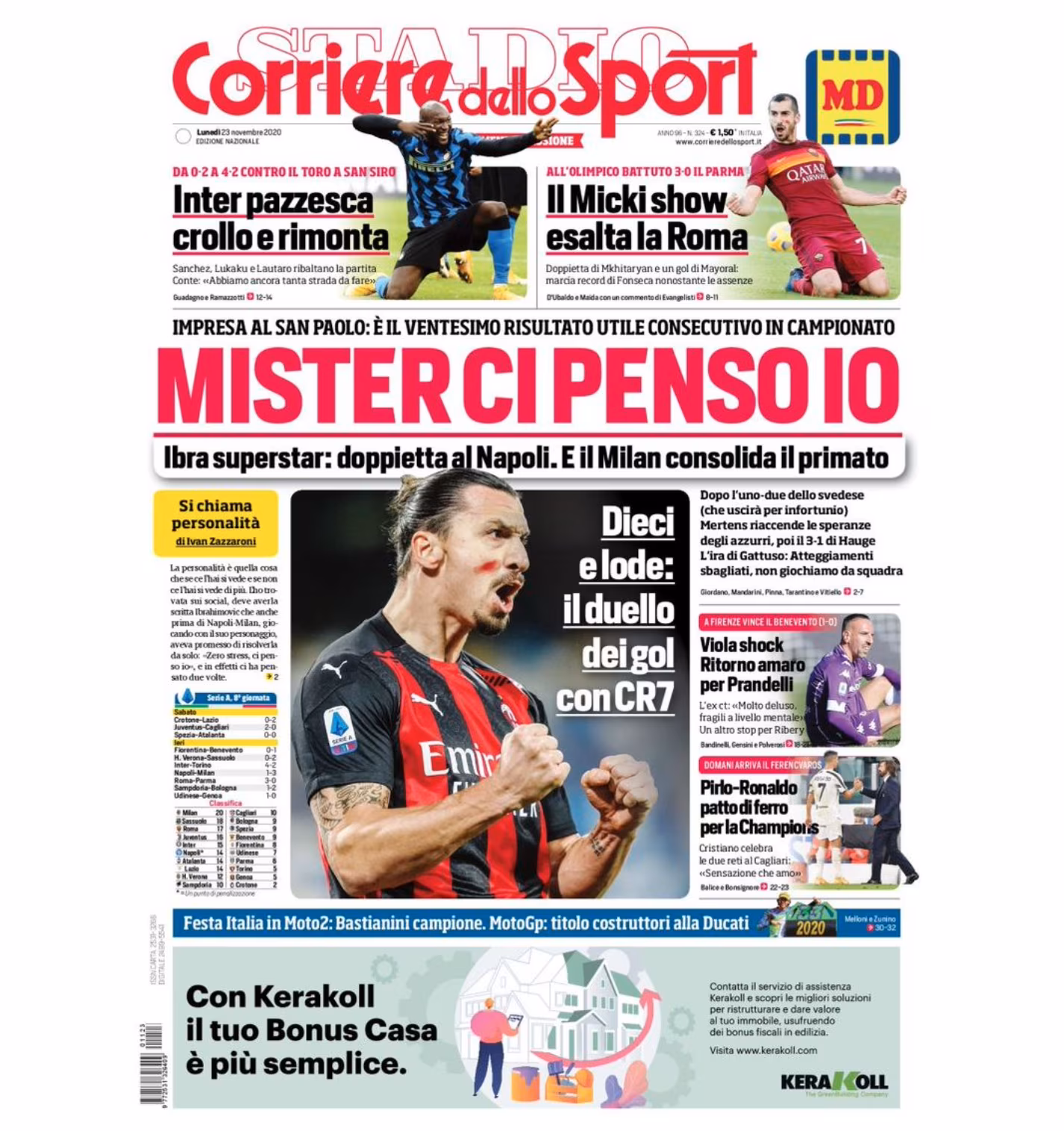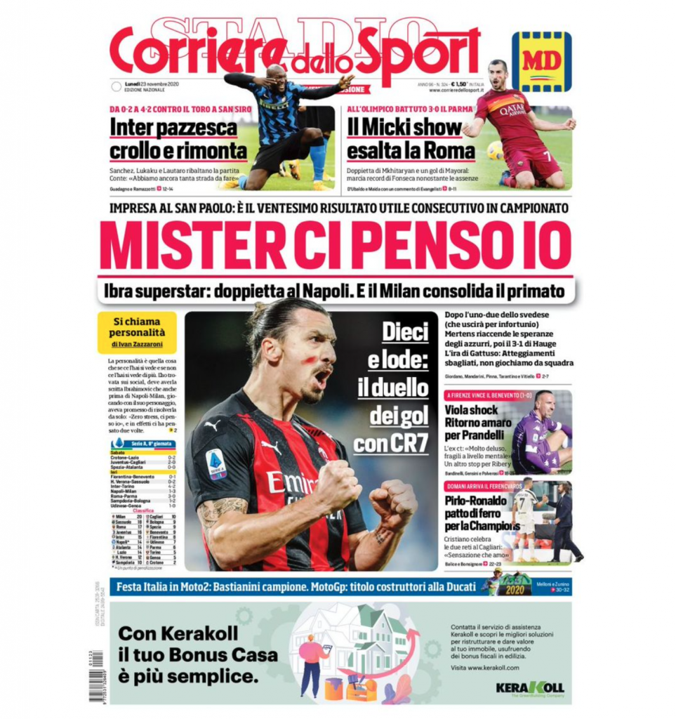 TORINO – La prima pagina de Il Corriere dello Sport in edicola oggi dedica il suo taglio alto alle vittoria di Inter e Roma contro Torino e Parma, mentre il taglio centrale è dedicato alla vittoria sul Napoli del Milan, grazie ad un Ibrahimovic sempre più in forma.