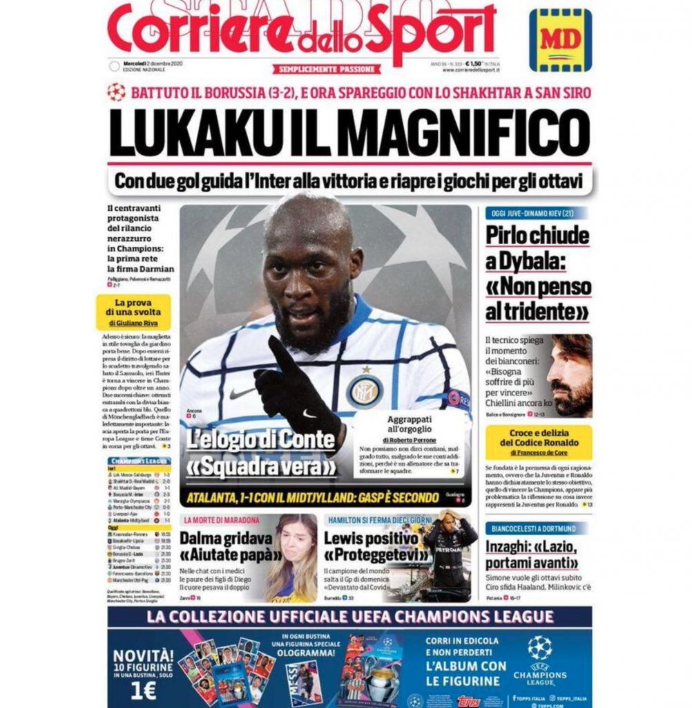 TORINO – La prima pagina de Il Corriere dello Sport in edicola questa mattina dedica la sua apertura all’Iter e a “Lukaku il magnifico” che con due gol riapre i giochi per il passaggio agli ottavi dell’Inter.
