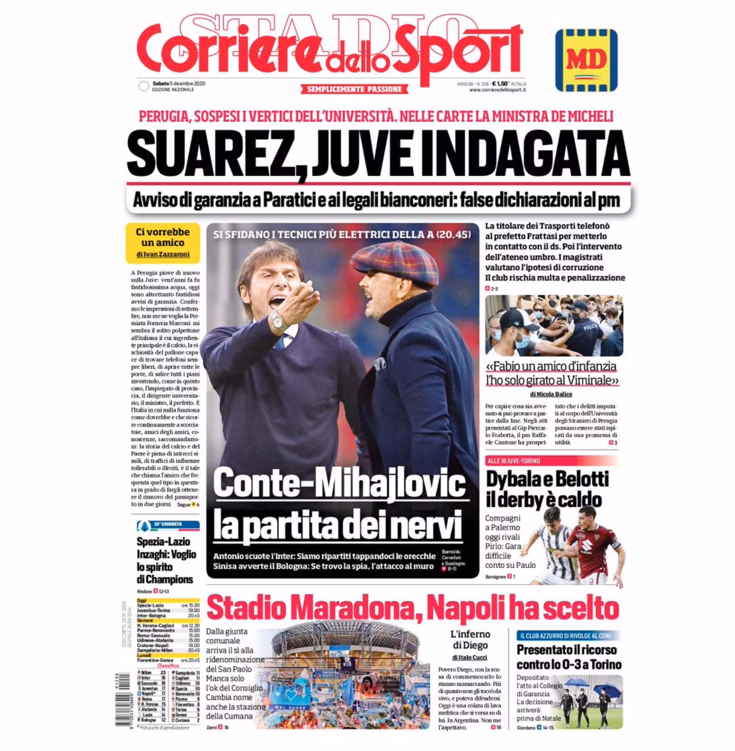 TORINO – La prima pagina de Il Corriere dello Sport in edicola oggi dedica il suo taglio alto alla Juventus: “Suarez, Juve indagata. Avviso di garanzia a Paratici e ai legali bianconeri: false dichiarazioni ai pm.”