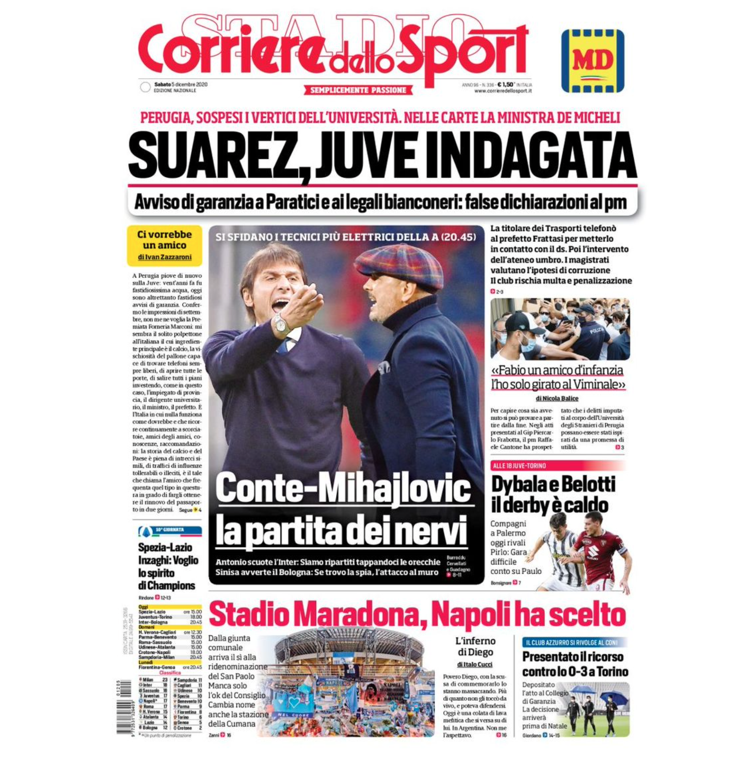 A lato spazio al derby, con la sfida tra Dybala e Belotti. A centro pagina la partita tra Inter e Bologna, con Conte-Mihajlovic sul filo dei nervi.