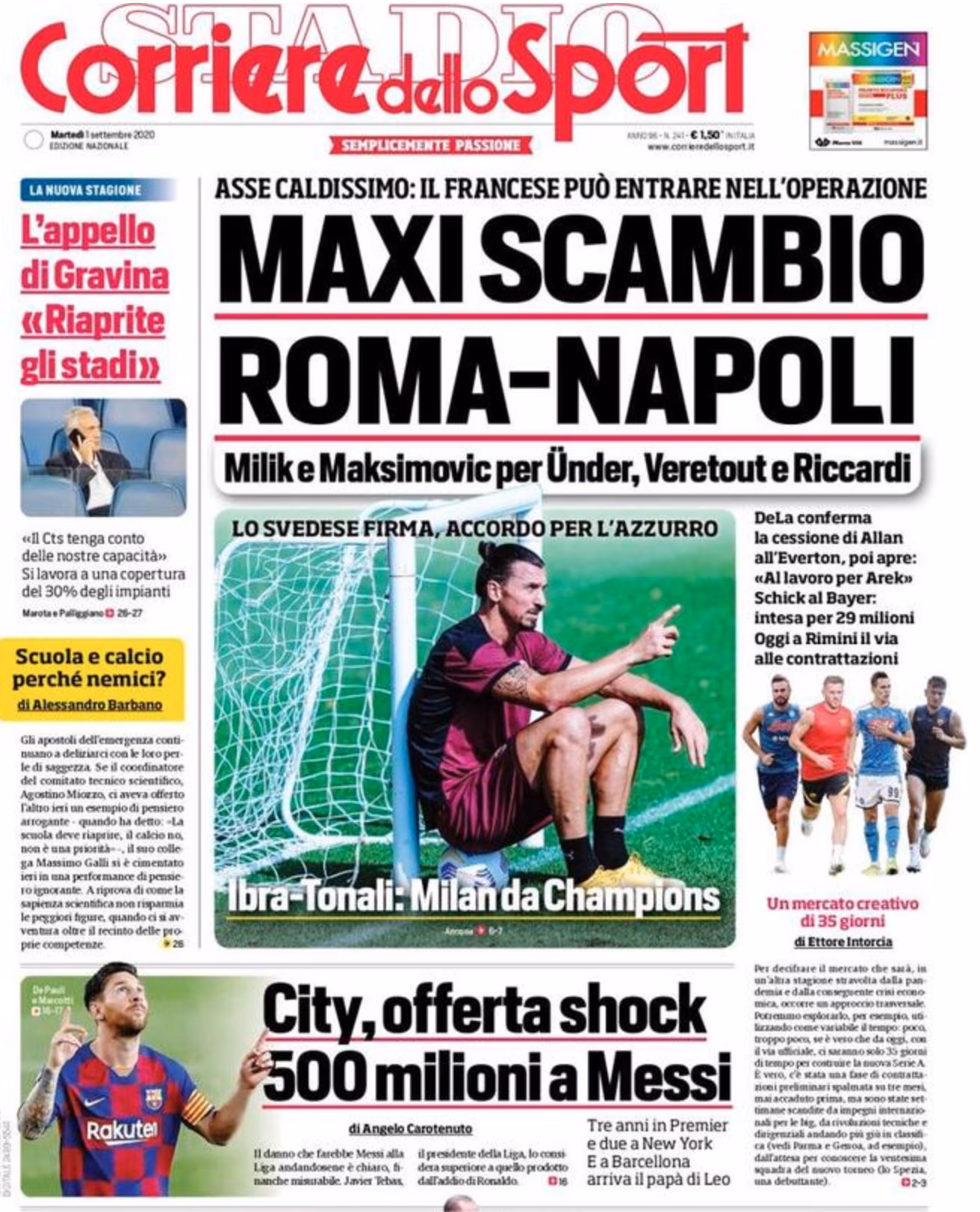 TORINO – La prima pagina de Il Corriere dello Sport in edicola oggi dedica il centro della prima pagina allo scambio tra Roma e Napoli con Milil e Maksimovic in giallorosso e Under, Veretout e Ricciardi ai partenopei.