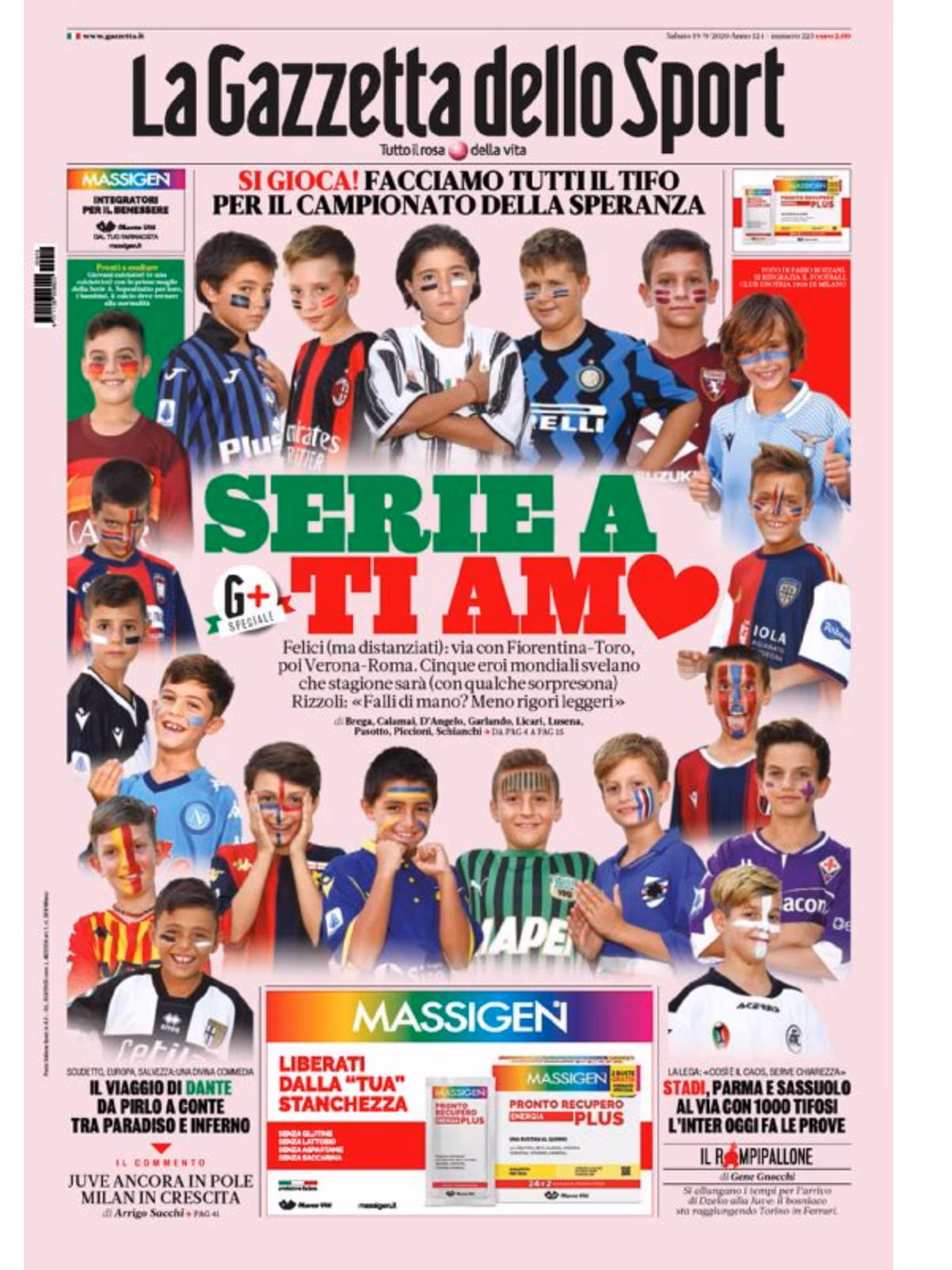 “Serie A ti amo” campeggia a centro pagina, con intorno un cerchio di bambini con le 20 maglie delle squadre iscritte al campionato. “Cinque eroi mondiali svelano che stagione sarà.”