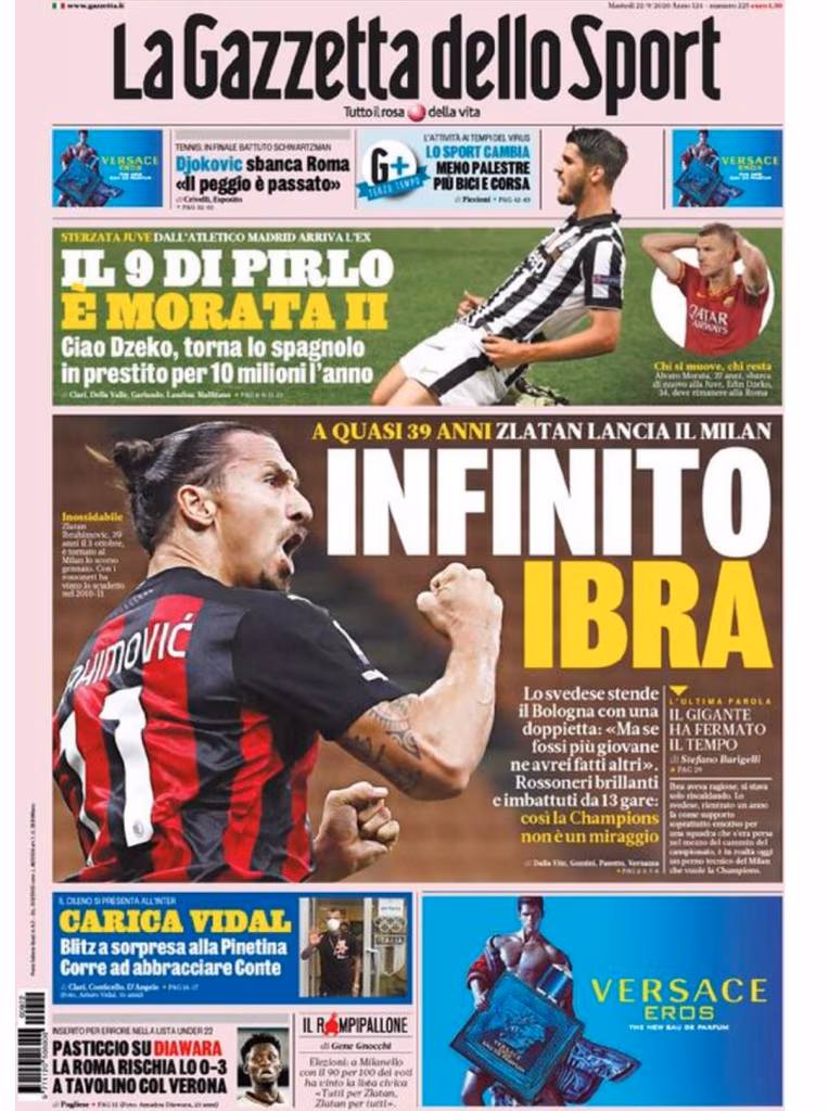 “Il 9 di Pirlo è Morata II. Ciao Dzeko, torna lo spagnolo in prestito per 10 milioni l’anno”. Sotto il titolo per il Milan, vittorioso nella sua prima uscita stagionale contro il Bologna.