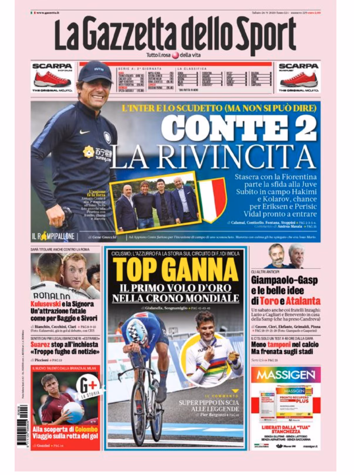 TORINO – La prima pagina de La Gazzetta dello Sport in edicola oggi è dedicata al debutto dell’Inter di Antonio Conte in campionato contro la Fiorentina: “Conte 2 La rivincita”.
