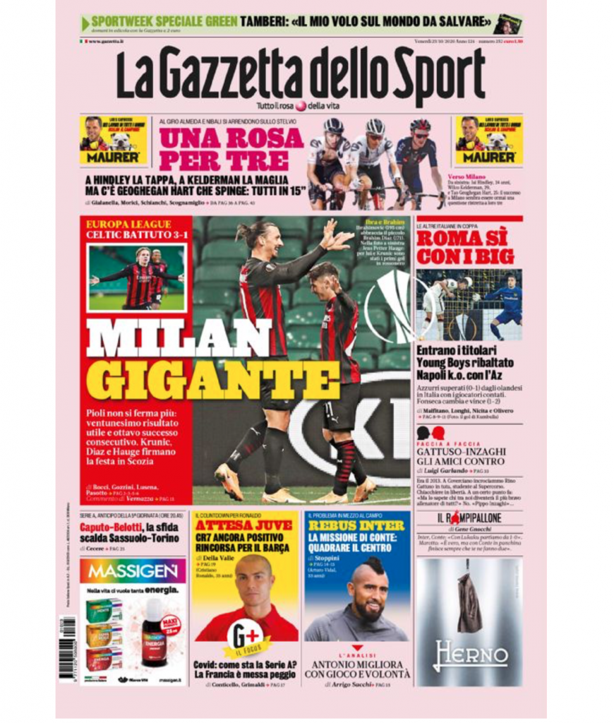 TORINO – La prima pagina de La Gazzetta dello Sport in edicola questa mattina è dedicata nella sua parte centrale all’Europa League, con il Milan vincitore ieri sera contro il Celtic, così come la Roma contro lo Young Boys.