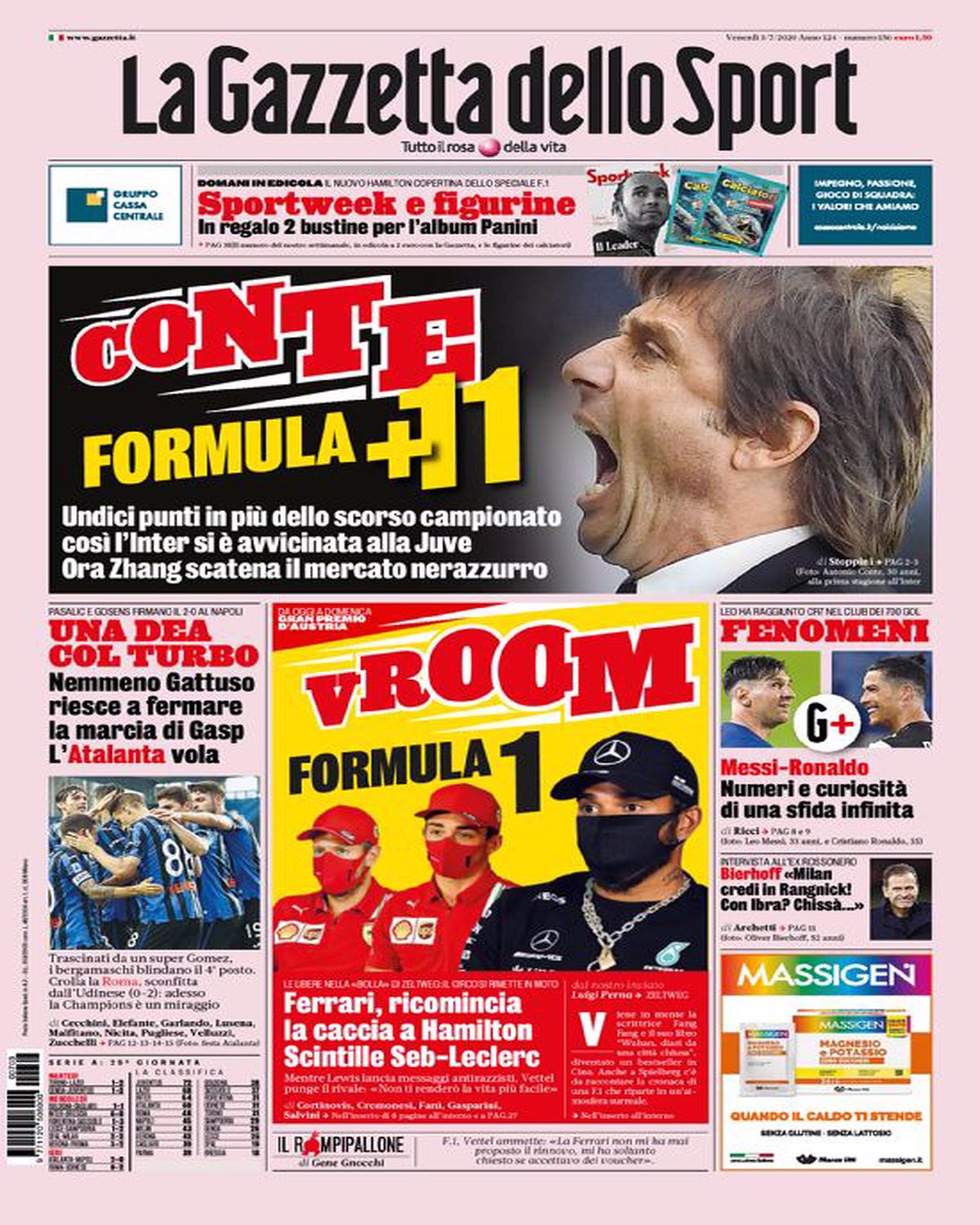 TORINO – La prima pagina de La Gazzetta dello Sport intitola così: “Conte formula +11”. Il riferimento è agli undici punti in più che Conte ha fatto rispetto all’Inter dello scorso campionato.