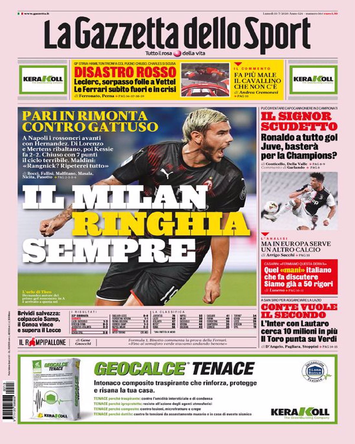TORINO – La prima pagina de La Gazzetta dello Sport intitola così: “Il Milan ringhia sempre”. Il riferimento è allo scontro diretto di ieri tra Napoli e Milan in cui i rossoneri sono riusciti ad ottenere un buon pareggio al San Paolo.