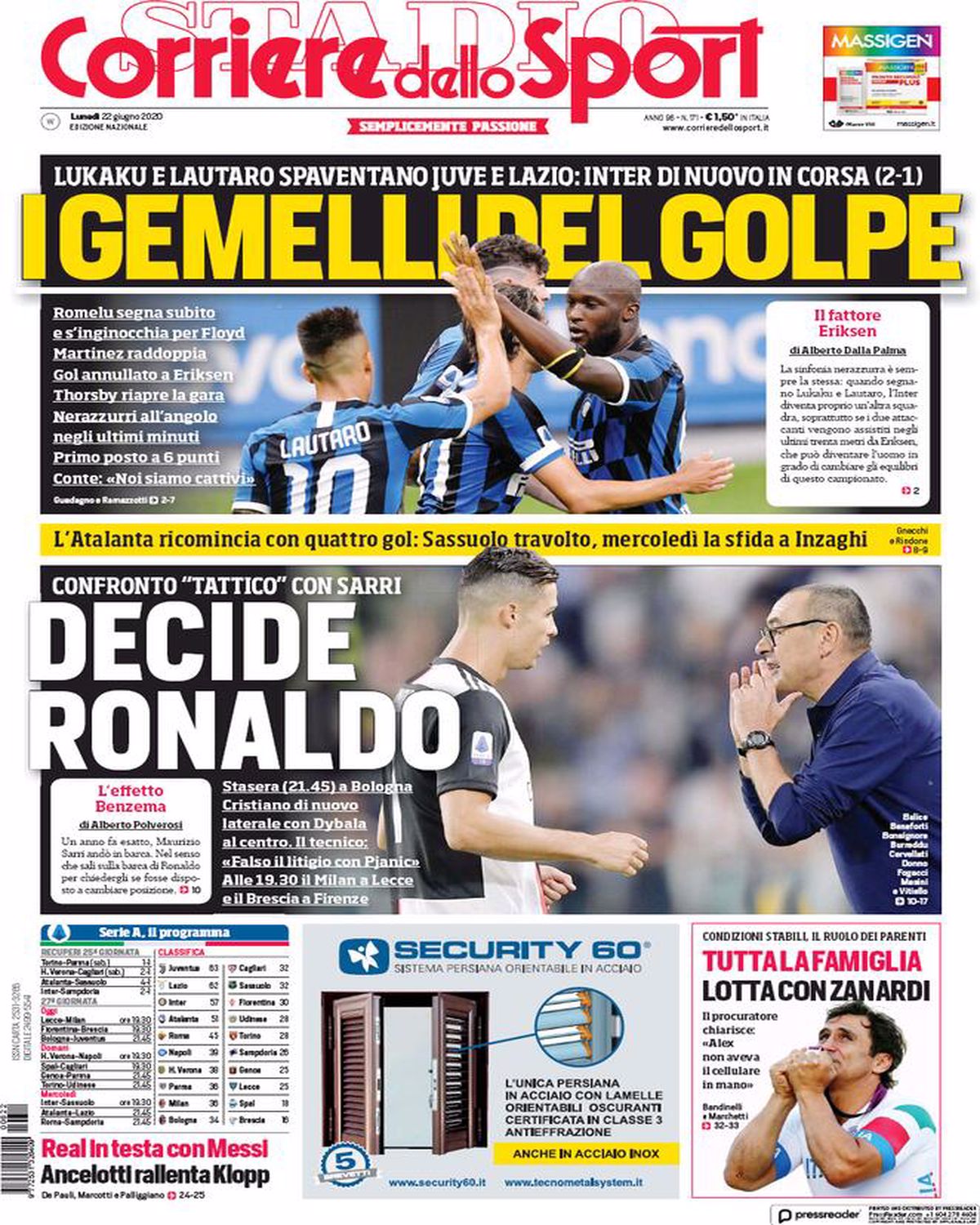 TORINO – La prima pagina del Corriere dello Sport intitola così: “Decide Ronaldo”. Il riferimento è alla sfida di stasera delle 21.45 in cui la Juventus affronterà il Bologna allo stadio Dall’Ara. Ronaldo tornerà laterale con Dybala al centro dell’attacco.