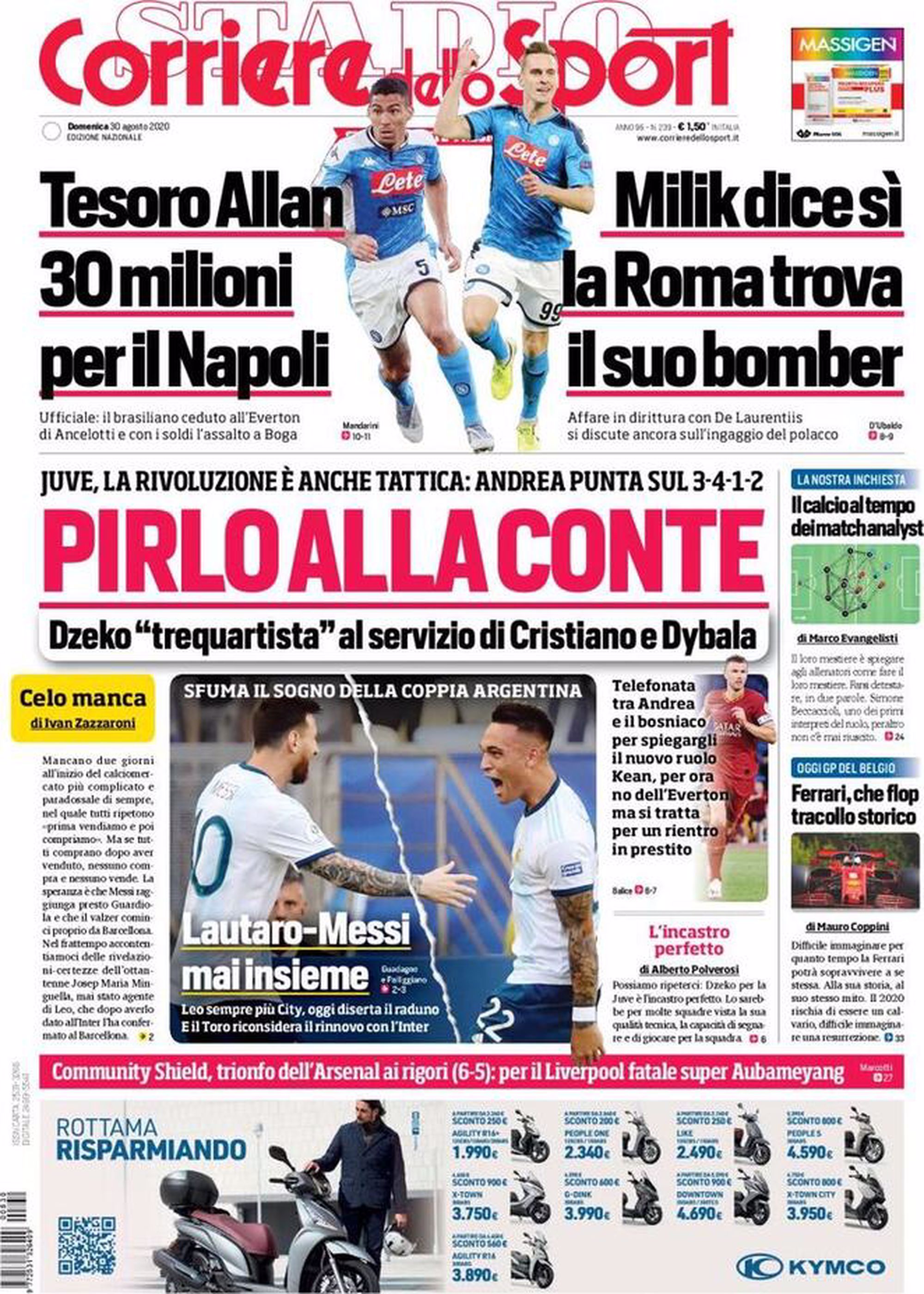 TORINO – La prima pagina del Corriere dello Sport intitola così: “Pirlo alla Conte”. Il riferimento è al nuovo sistema di gioco di riferimento del neo tecnico della Juventus, che sarà il 3-4-1-2. Nel caso in cui l’acquisto di Edin Dzeko andasse in porto, sarà il bosniaco a fare da trequartista dietro a Ronaldo ed a Dybala. Ma attenzione perché, proprio in queste ultime ore, è arrivata anche un’altra clamorosa novità di mercato in casa Juventus. Si riapre tutto, trattativa a sorpresa: “Ecco l’ultima idea bianconera!” >>>VAI ALLA NOTIZIA