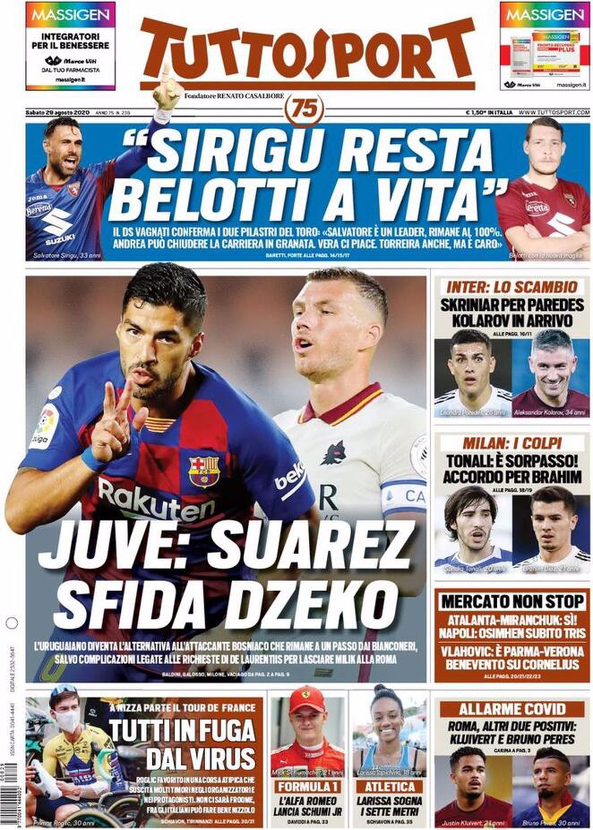 TORINO – La prima pagina di Tuttosport intitola così: “Juve: Suarez sfida Dzeko”. Il riferimento è a Luis Suarez, che rappresenterebbe una valida alternativa ad Edin Dzeko per l’attacco della Juventus. L’uruguaiano è in uscita dal Barcellona e si libererà a parametro zero.