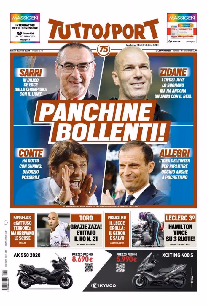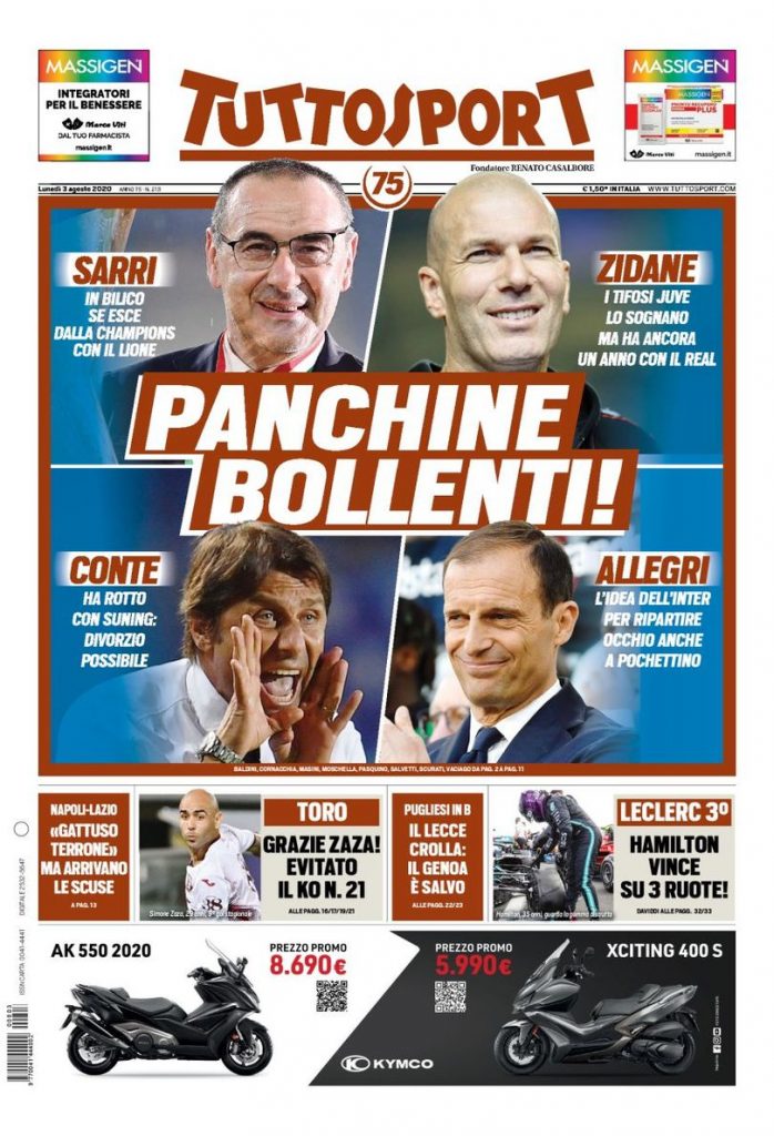 TORINO -Il numero di Tuttosport in edicola oggi dedica la sua apertura alle panchine europee: “Panchine bollenti” questo il titolo che campeggia in prima pagina, con i nomi di Sarri, Zidane, Conte e Lippi pronti ad animare il mercato.