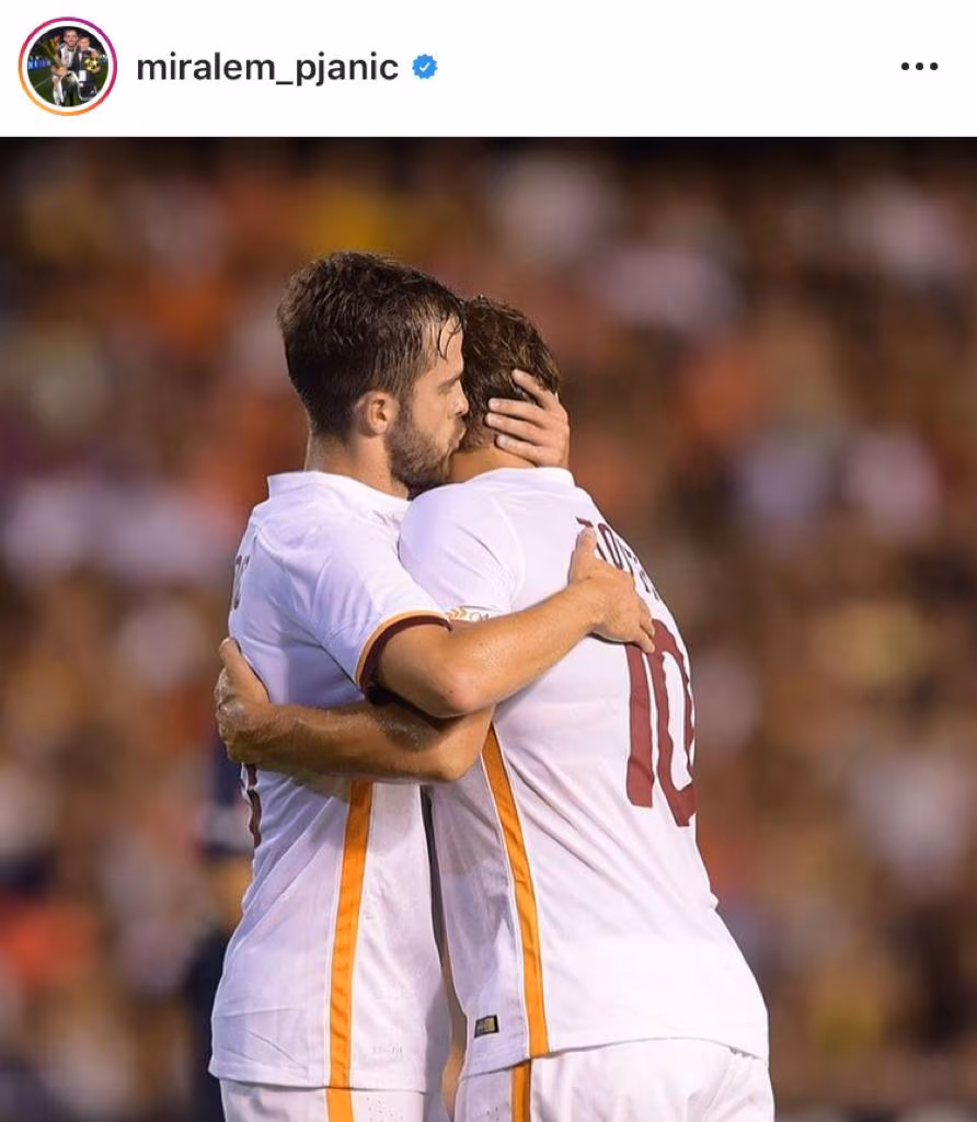 TORINO – Sono passati gia diversi anni da quando l’ex capitano e simbolo della Roma, Francesco Totti, ha smesso di giocare a pallone, ma nonostante il tempo, ancora oggi, viene osannato e acclamato ogni domenica dalla sua tifoseria, specie dopo il divorzio totale con il club nell’ultima estate. Oggi l’ex numero 10 giallorosso spegne 43 candeline e in tantissimi, tra ex compagni e altre icone dello sport, hanno voluto recapitargli gli auguri attraverso i loro account social. Il piu recente, è quello del bianconeroo, Miralem Pjanic, suo ex compagno di squadra ia tempi della Roma, il quale ha condiviso alcuni scatti che li immortalano insieme e sotto al post il seguente messaggio: “Rispetta tutti. Ascolta in silenzio. Impara dai migliori. Tanti auguri fratello”.