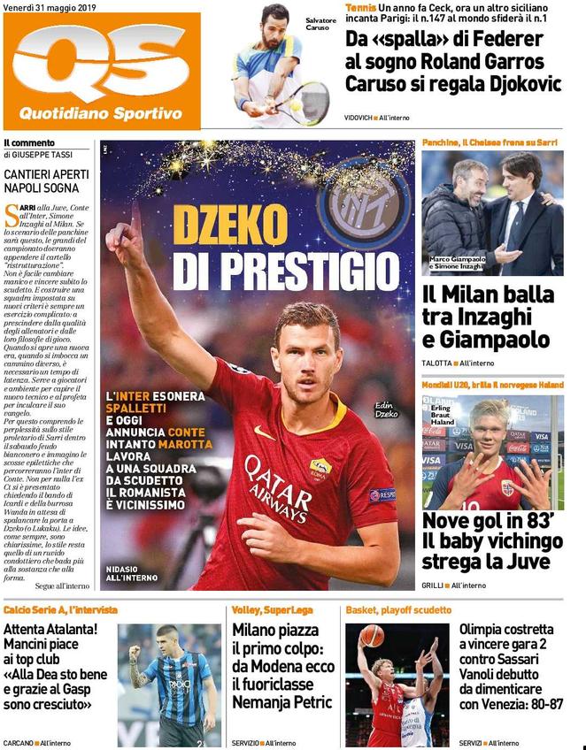TORINO – La prima pagina del Quotidiano Sportivo di oggi, 31 maggio. In apertura la trattativa che potrebbe portare Edin Dzeko a vestire la maglia dell’Inter, che oggi annuncia Conte. In evidenza poi, anche il Milan, ancora alla ricerca di un allenatore per il futuro con Inzaghi e Giampaolo in prima linea per sostituire Gennaro Gattuso.