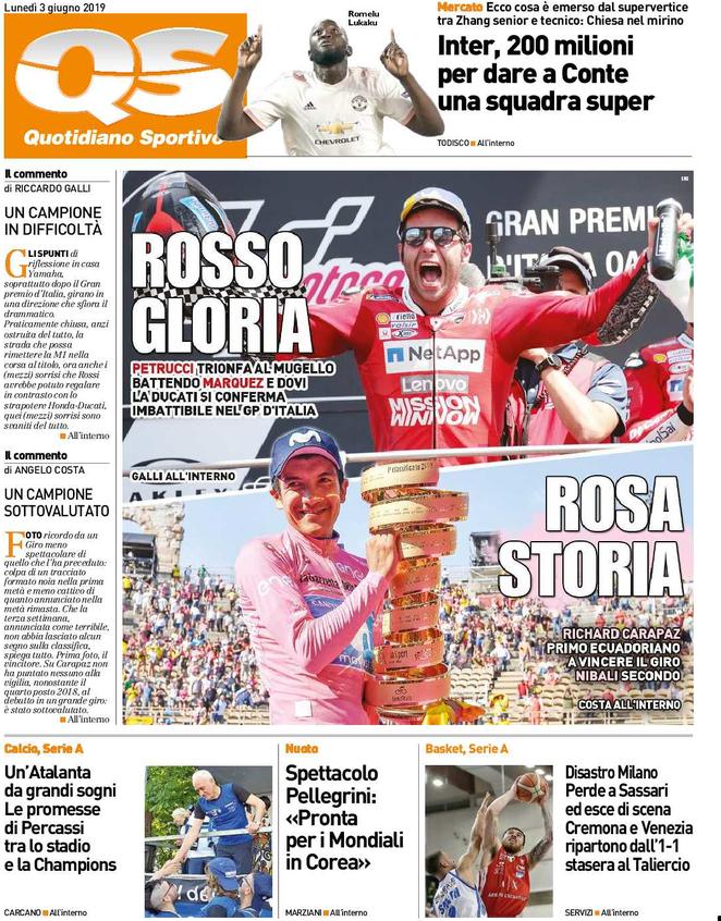 TORINO – Ecco l’apertura in prima pagina del Quotidiano Sportivo. In apertura la questione relativa al mercato dell’Inter, pronta ad investire una cifra vicina ai 200 milioni per consegnare ad Antonio Conte una squadra capace di competere con la Juventus. Al centro ci si concentra sulla vittoria di Richard Carapaz al Giro d’Italia.