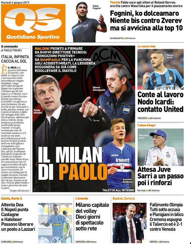 TORINO – Ecco l’apertura in prima pagina del Quotidiano Sportivo. In apertura la questione relativa al nuovo Milan di Maldini.”Sensazioni positive” dice proprio il nuovo direttore tecntico del Milan, mentre intensifica l’assalto a Marco Giampaolo per la panchina rossonera della prossima stagione.